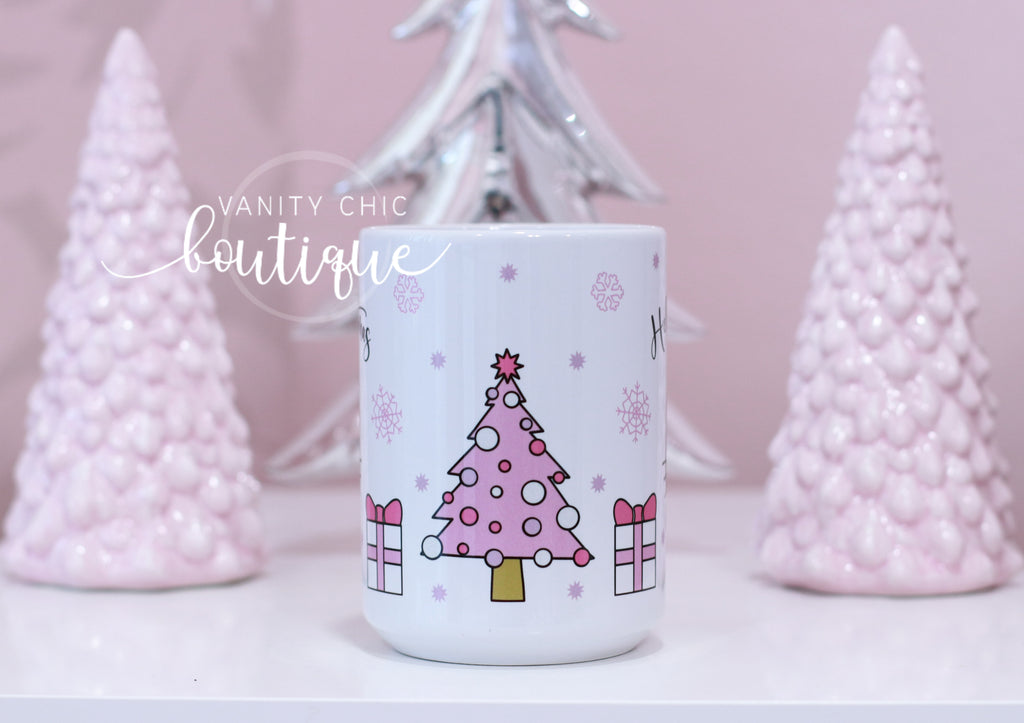 White 15 Oz Ceramic Mug with Pink handle/ Inside Rim and " HK Christmas" design.